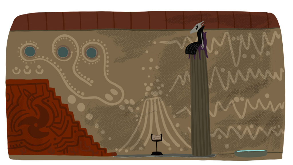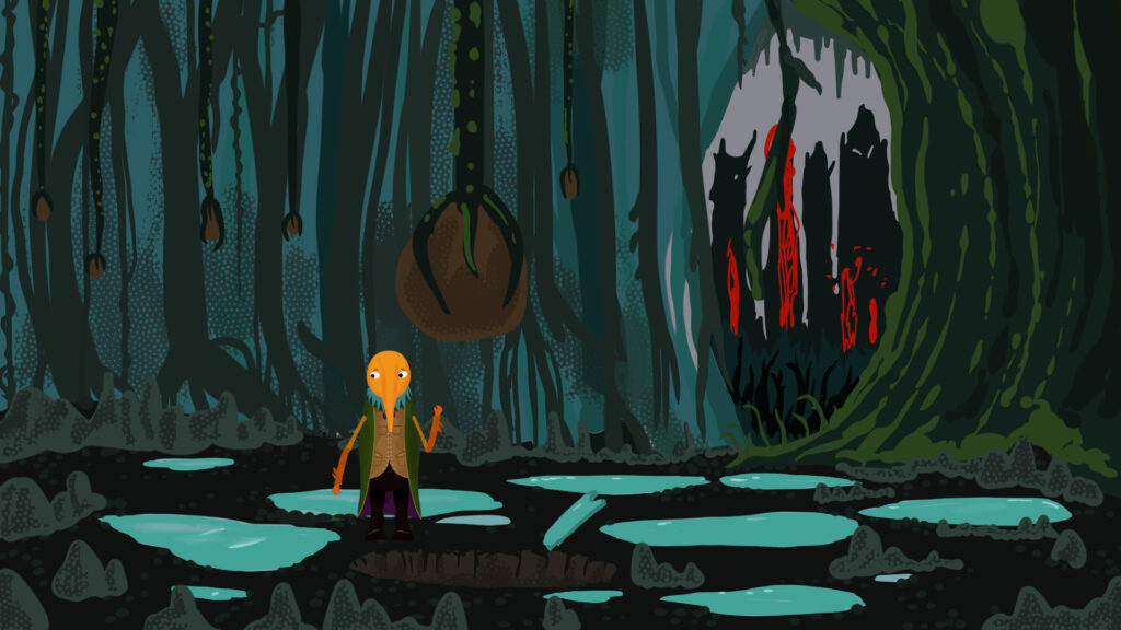 Player will do everything with the mouse. When the mouse explores the screen, the world reacts with subtle feedback. Water burbles, insects buzz, leaves rustle, glowy things glow harder, creatures wave at the player, bubbles pop, fountains splash and guitar twangers twang. The environment will be made very “tactile” to help the player relax and feel free to explore the screen.